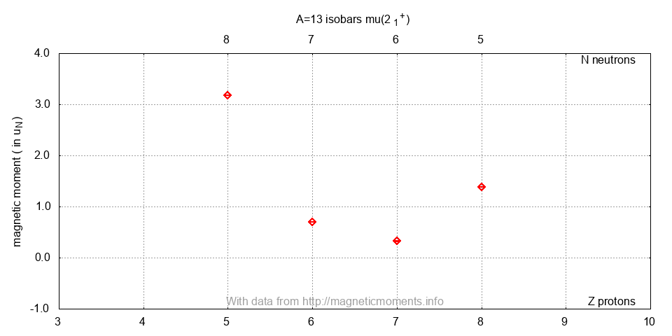 | 13O | 23115 ± 10 | 0. | 8.58 ms | 3/2- | 1.3891(3) d, K | [1H] | b-NMR | 1996MA38 | 10.1007/BF02150194 | |||