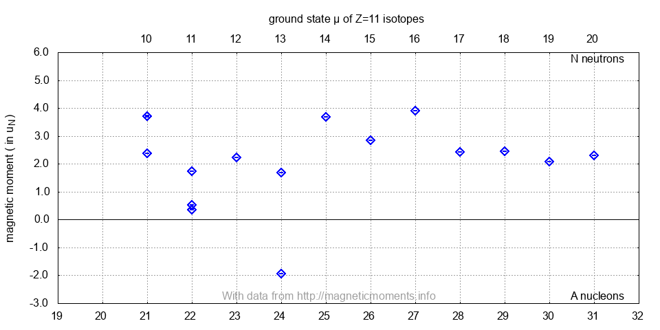 | 23Na | -9529.8525 ± 0.0018 | 0. | stable | 3/2+ | +2.217522(2) | AB/D | 1974BE50 | 10.1007/BF01680407 | ||||