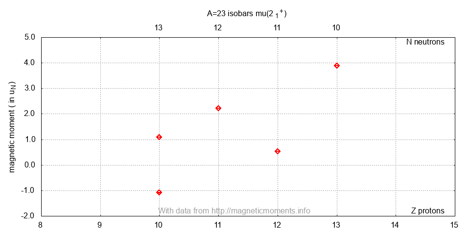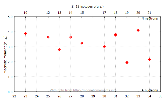 | 23Al | 6748.1 ± 0.3 | 0. | 37.2 s | 5/2+ | +3.889(5) | b-NMR | 2006OZ04 | 10.1103/PhysRevC.74.021301 | ||||