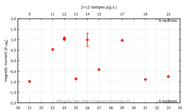 | 33Mg | 4962.2 ± 2.9 | 0. | 90.5 ms | 3/2+ | -0.7456(5) | [31Mg] | b-NMR , LRS | 2007YO06 | 10.1103/PhysRevLett.99.212501 | |||