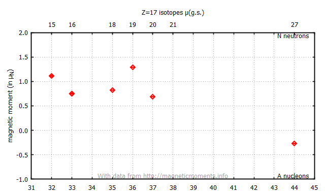 | 33Cl | -21003.3 ± 0.4 | 0. | 2.52 s | 3/2+ | + 0.7549(3) d | b-NMR | 2004MA98 | 10.1016/j.nuclphysa.2004.09.075 | ||||