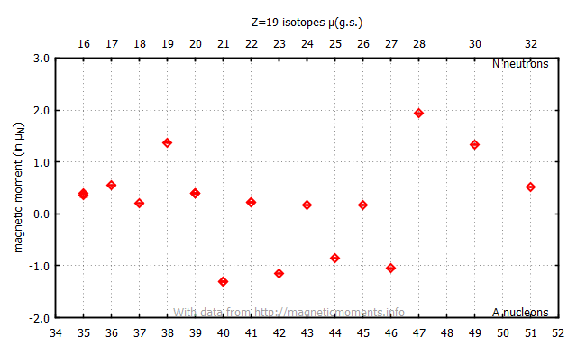 41K | -35559.543 ± 0.004 | 0. | stable | 3/2+ | +0.2148701(2) | AB/D | 1974BE50 | 10.1007/BF01680407 | ||||