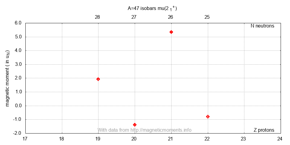 47Ti | -44936.4 ± 0.4 | 0. | stable | 5/2- | -0.78848(1) | [39K] | NMR | 1965DR03 | 10.1080/14786436508228135 | |||