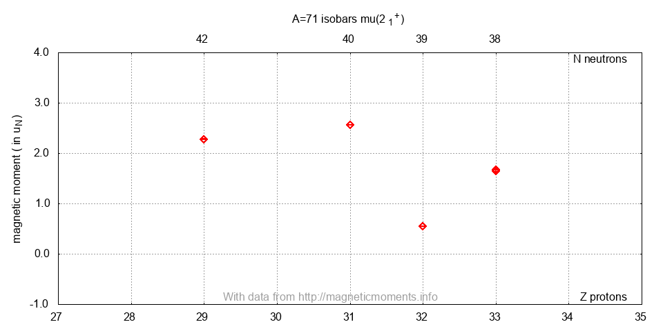 71As | -67893 ± 4 | 0. | 65.3 h | 5/2- | (+)1.674(2) | NMR/ON |